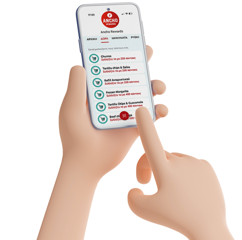 Το Ancho Rewards είναι το πρόγραμμα επιβράβευσης του Ancho Mexican Grill που σε ανταμείβει κάθε φορά που απολαμβάνεις το αγαπημένο σου φαγητό. Με κάθε αγορά, κερδίζεις πόντους που μπορείς να εξαργυρώσεις σε γευστικές ανταμοιβές!